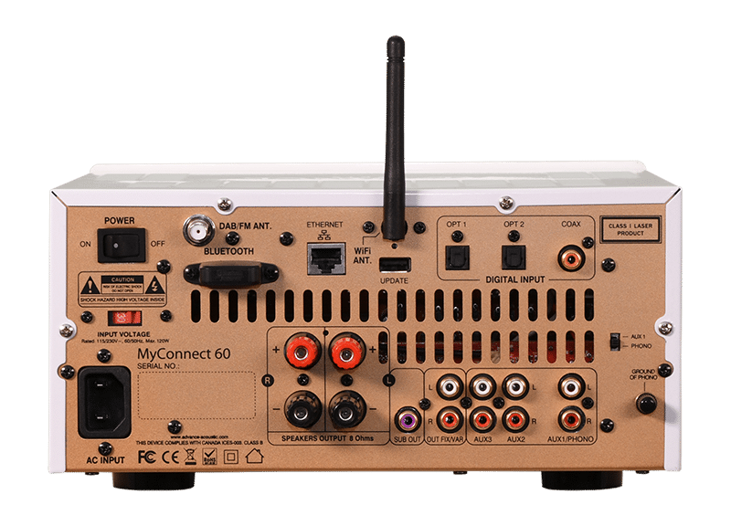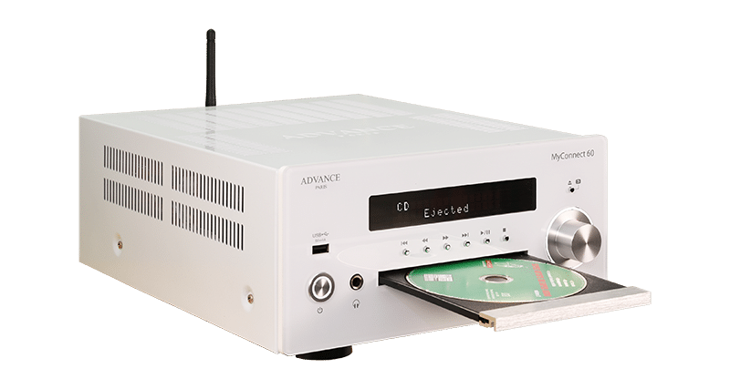 Een All in One met bedieningsgemak, dus inclusief een cd-speler, streamer en versterker en met een bescheiden afmeting van slechts 27,3 cm breed. Door de advance Playstream is MyConnect 60 een netwerkspeler (WiFi of bedraad), waarmee je muziek vanaf je computer of NAS kunt afspelen. Daarnaast worden muziekdiensten zoals o.a. SpotifyConnect, Tidal, Qobuz, Deezer, etc en internetradiostations via TuneIn zijnn beschikbaar. 3 Ingangen, waarbij er een gebruikt kan worden als een platenspeler aansluiting (moving magnet). De versterker biedt een vermogen van 2x 48 Watt bij 8 Ohm of 2 x 70W (4 Ohm). D/A convertor van Wolfson WM8720 (24bit/192kHzVoldoende om de huiskamer te vullen. Indien meer vermogen wenselijk is, zijn de My Connect 150 of My Connect 250 ter beschikking van Advance Paris. Een subwoofer aansluiting ontbreekt niet