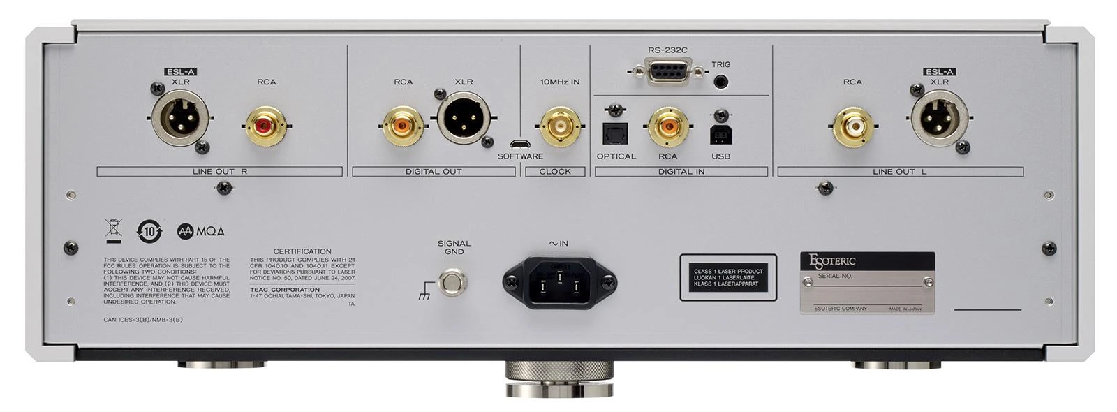 Naast lijnaansluitingen (XLR, RCA) voor aansluiting op een versterker, wordt ook gebruikgemaakt van ES-LINK Analog, Esoteric’s gepatenteerde stroomoverdrachtsmethode. Door gebruik te maken van de krachtige stroomtoevoercapaciteit van het HCLD-buffercircuit, kunnen signalen krachtig worden verzonden zonder beïnvloed te worden door de impedantie van het signaalpad, waardoor u het potentieel van compatibele apparaten optimaal kunt benutten.