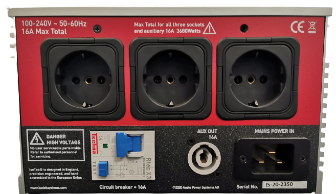 Het V5-ontwerp is voorzien van een RCBO-zekeringssysteem van 16 A voor de drie hoge stroom contactdozen, die 3.680 W bij 230 V of 1.840 W bij 115 V leveren.