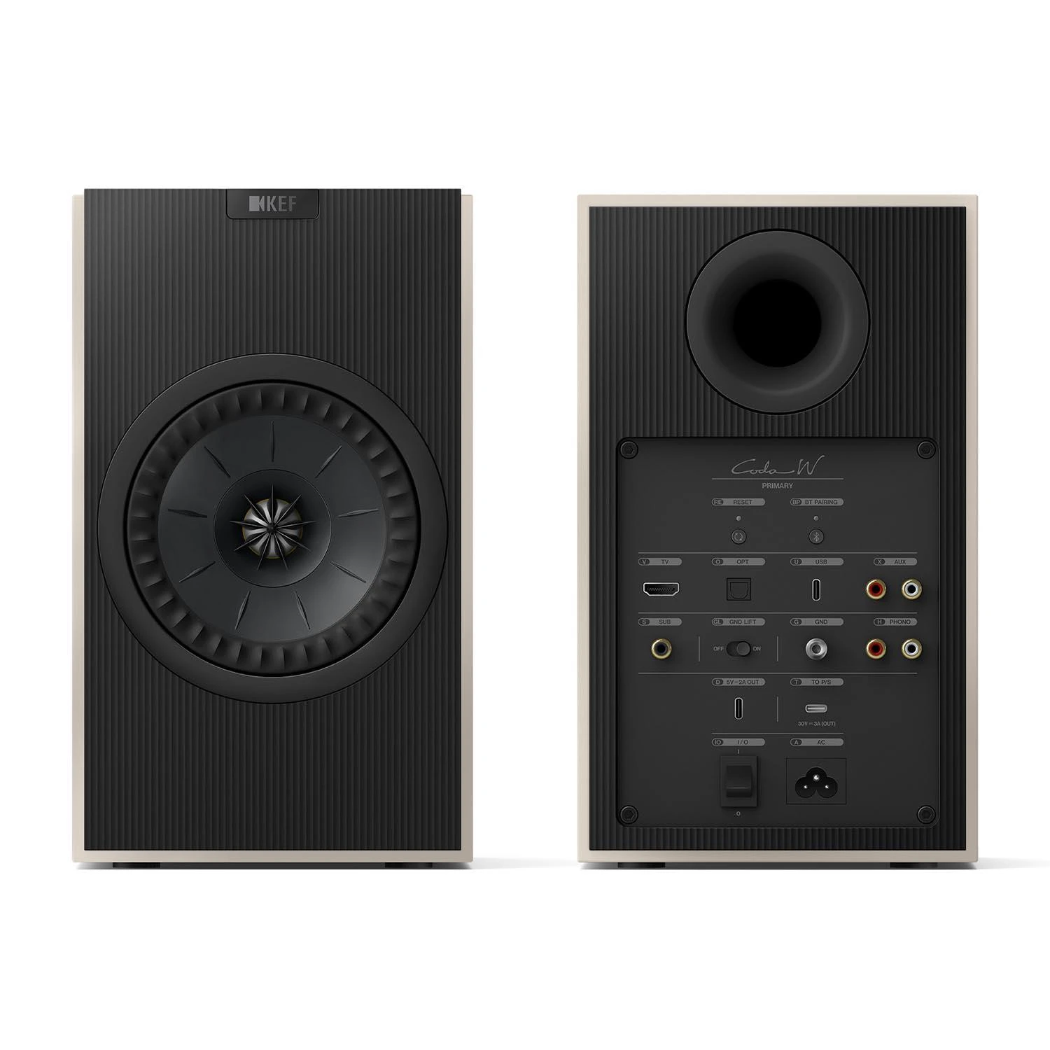 De KEF Coda W bestaat uit een masterspeaker waar we met Bluetooth naar kunnen streamen. Deze speaker heeft ook een echte platenspeler aansluiting, een analoge RCA en digitale ingangen zoals USB, Optisch en HDMI. Tevens heeft de CODA W ook nog een aansluiting voor een subwoofer. De andere luidspreker verbind u doormiddel van de bij geleverde USB kabel.