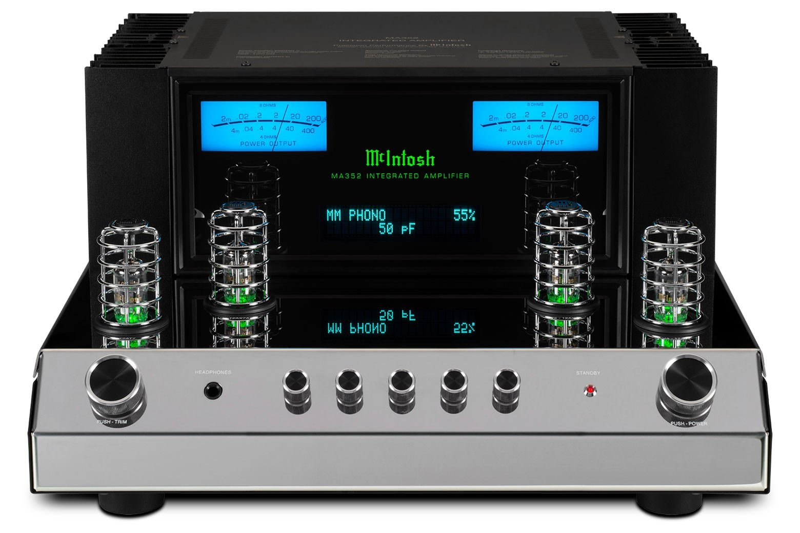 De MA352 heeft een voorversterkersectie met vacuümbuizen die wordt aangedreven door een paar 12AX7A en een paar 12AT7 vacuümbuizen; de uitgangstrap is een direct gekoppelde solid-state versterker die 200 Watt per kanaal naar 8 Ohm-luidsprekers of 320 Watt per kanaal naar 4 Ohm-luidsprekers levert – genoeg vermogen om vrijwel elke set luidsprekers goed aan te sturen. Dual scale blauwe wattmeters geven een nauwkeurige uitlezing van het uitgangsvermogen voor beide luidsprekerimpedanties.